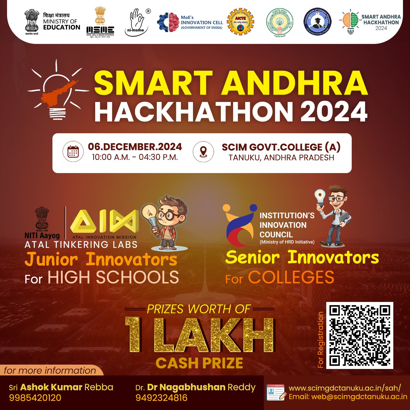 Smart Andhra Hackathon aims to find innovating solutions to real world problems from high school students under junior incubation category and UG degree level students under senior incubation category . The objective of this event is to foster curiosity, creativity, and imagination in young minds; and inculcate skills such as design mindset, computational thinking, adaptive learning, physical computing etc. Date : 06-01-2025, 10:00 AM Venue : Seminar Hall, SCIM GC(A), Tanuku.